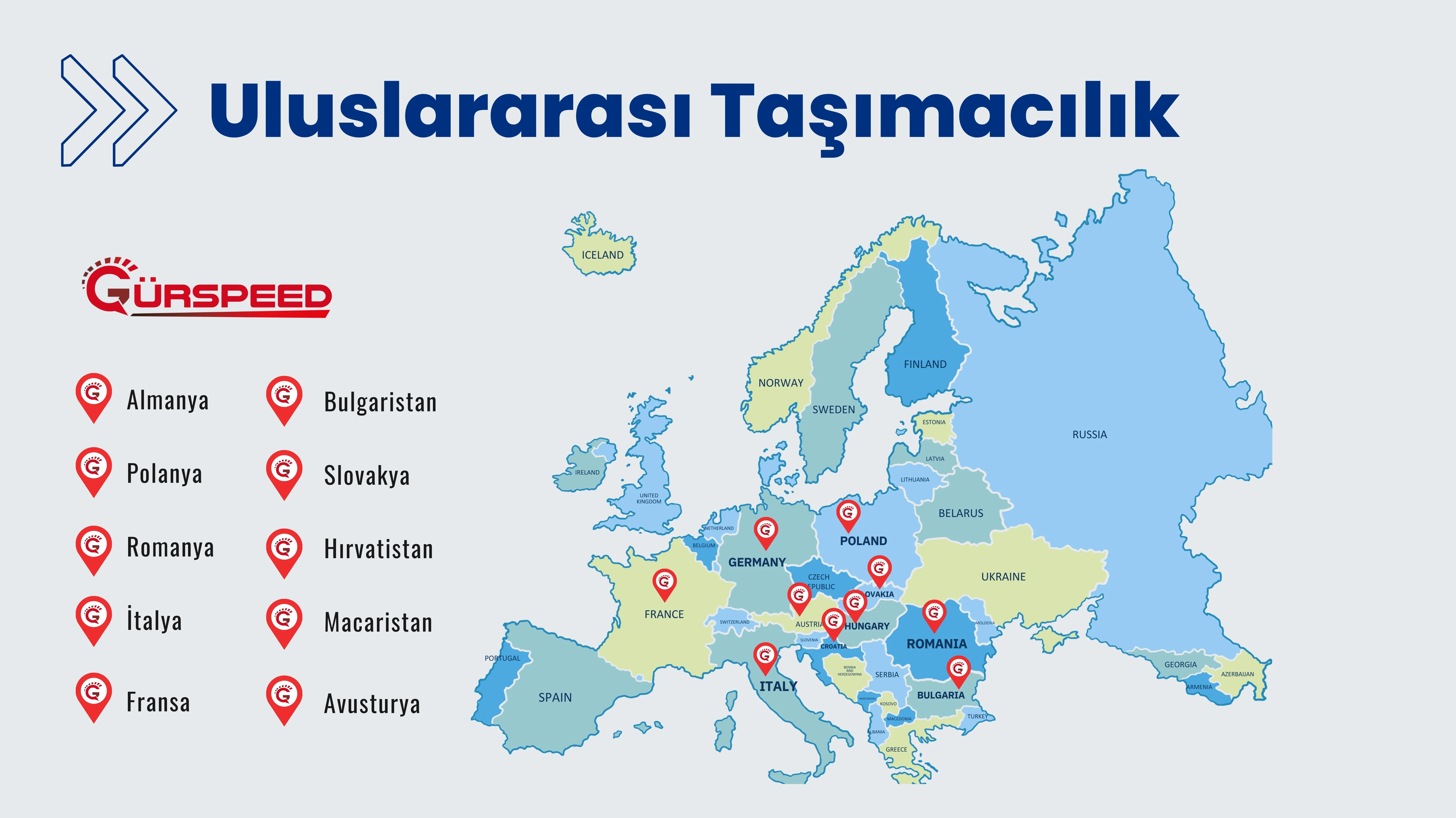 Gürspeed olarak, Avrupa’nın birçok ülkesine güvenli, hızlı ve etkin lojistik hizmetler sunuyoruz. Yılların verdiği tecrübe ve profesyonel ekibimizle, müşterilerimize en uygun taşımacılık çözümlerini sağlıyor; yüklerinizi zamanında ve sorunsuz şekilde yerine ulaştırıyoruz.
